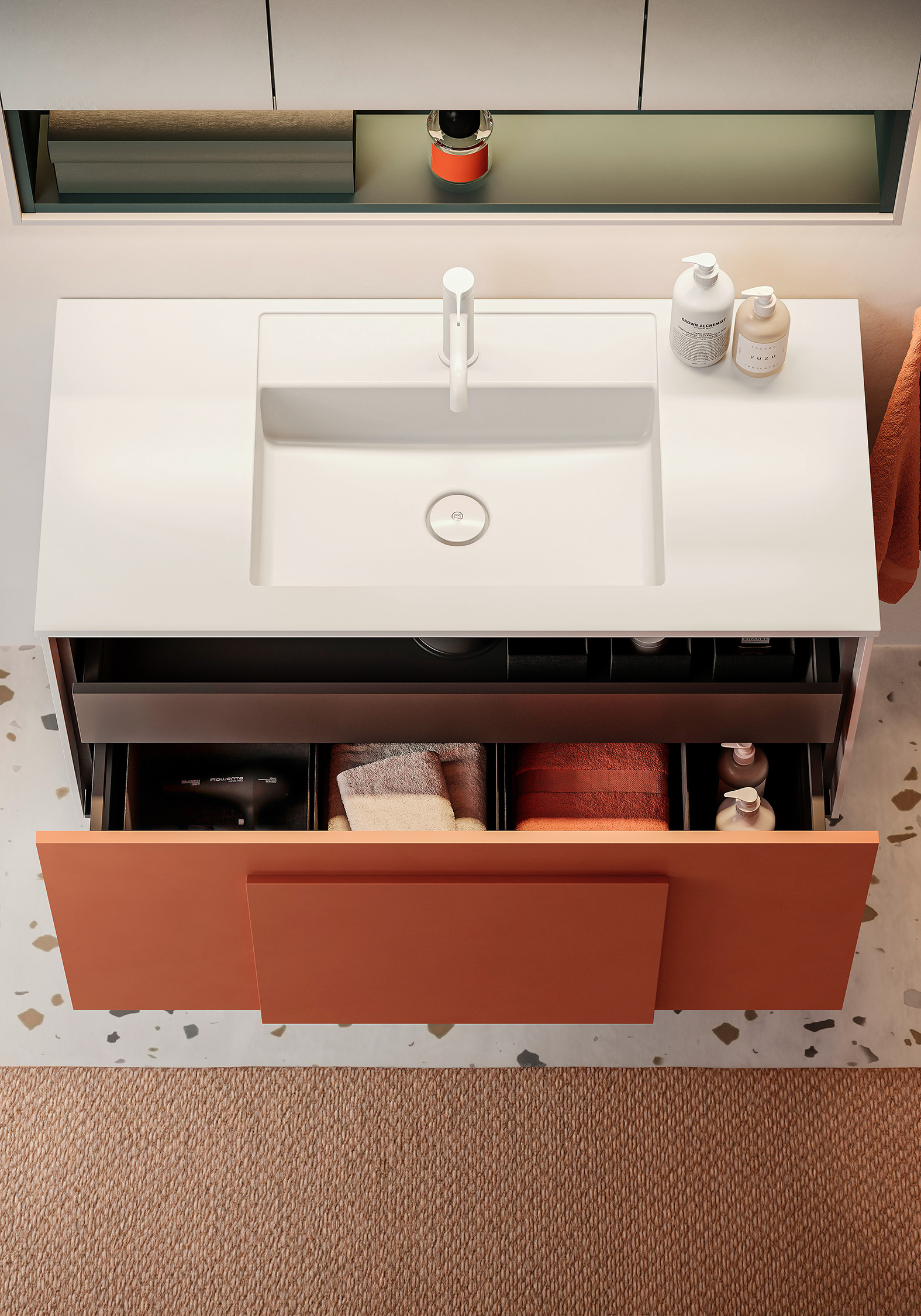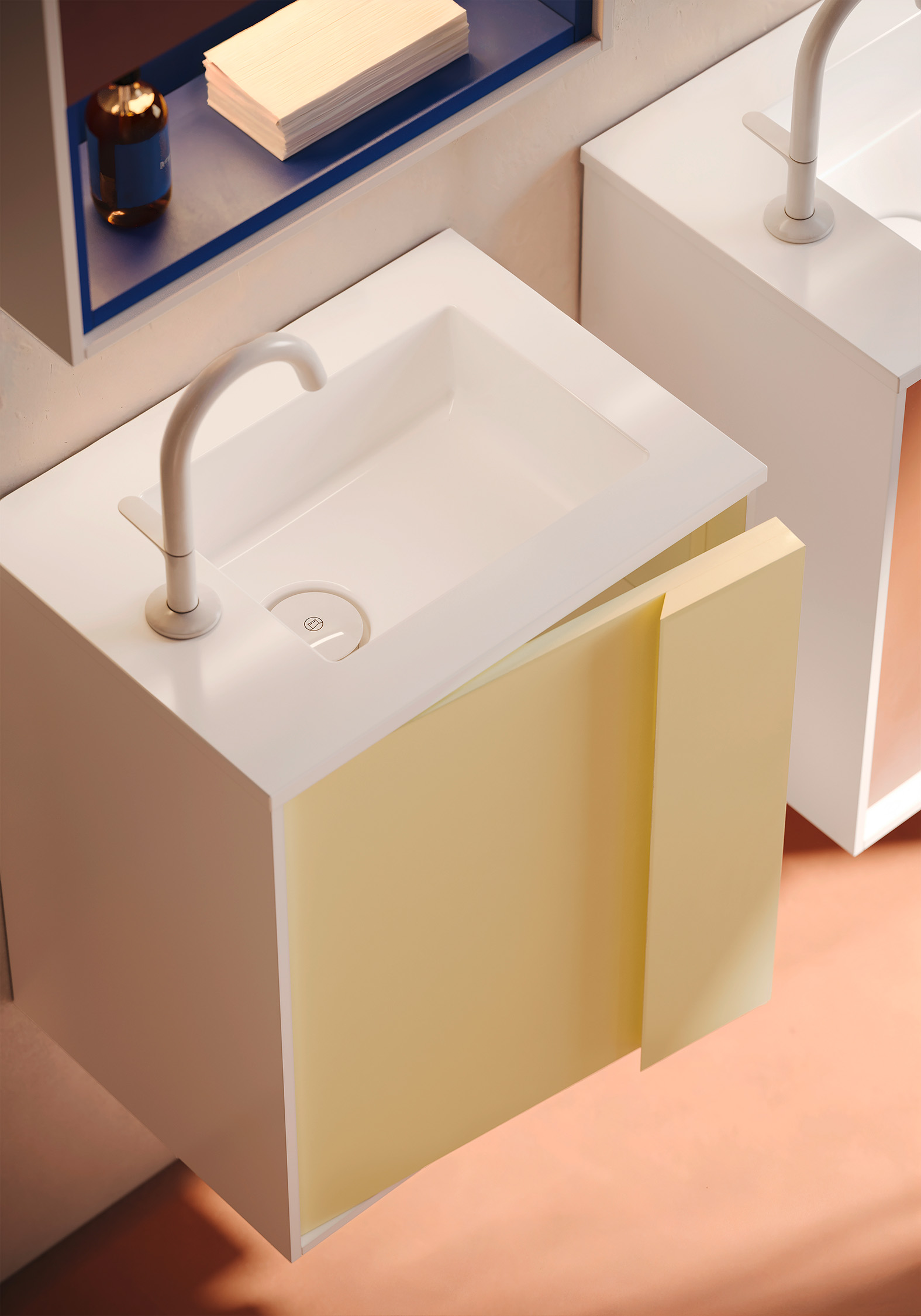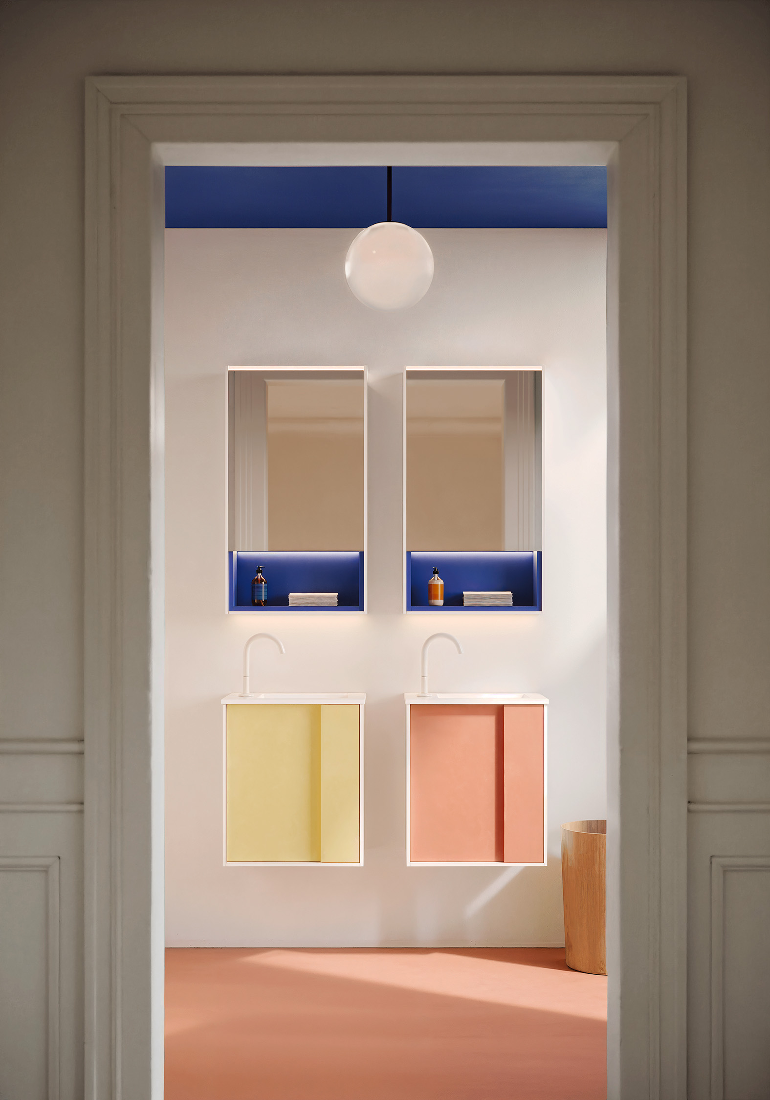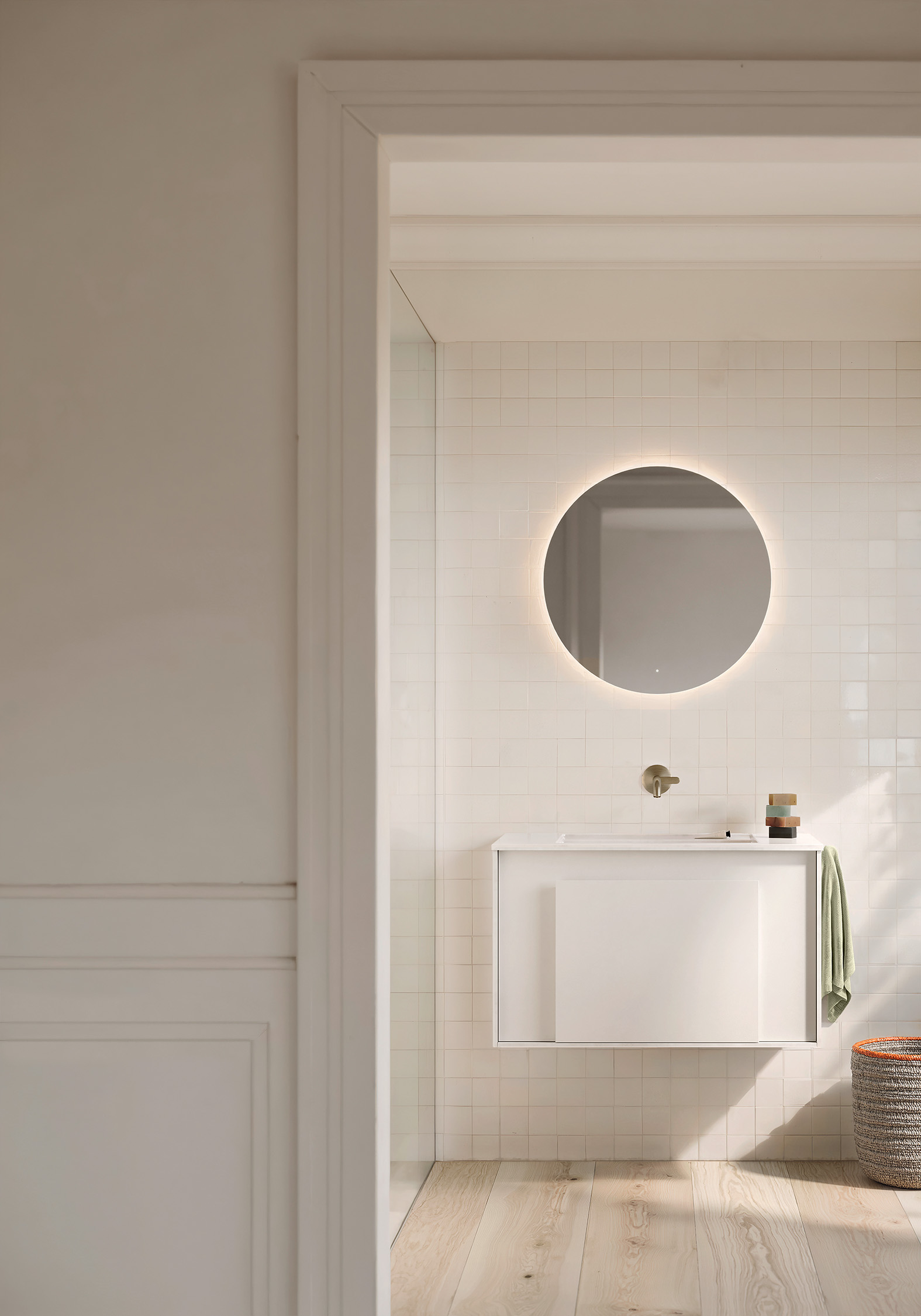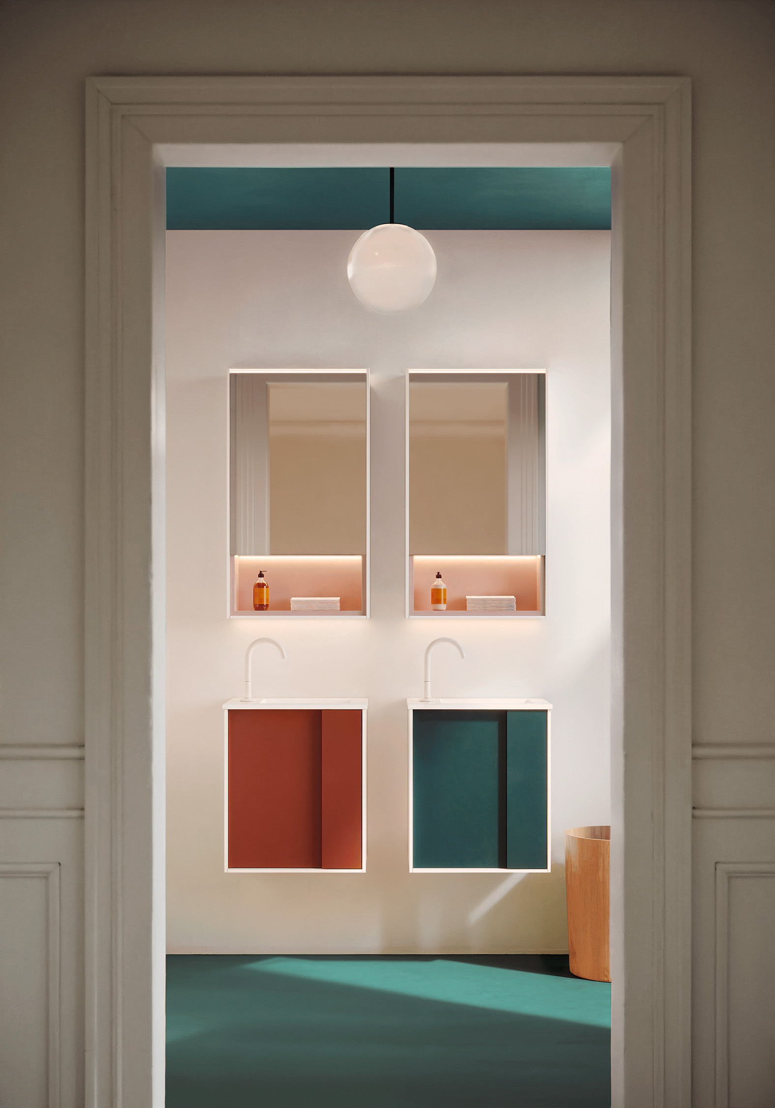 „Es ging mir darum zu sehen, wie die Kraft einer Farbe den Charakter einer Architektur und einer Innenarchitektur prägen kann“, so die Designerin Jeannette Altherr. „Da es im Badezimmer nur sehr wenige Möbel gibt, ist ihre Farbgebung von besonderer Bedeutung für die Atmosphäre des gesamten Raums. Und darüber hinaus, denn das minimalistische Design von Moto ermöglicht es, mit ganz wenigen Mitteln an das Interior Design der gesamten Wohnung anzuknüpfen.“ So kann auch in kleinen Badezimmern mit wenigen Elementen eine intensive Atmosphäre erzeugt werden, ohne den Raum zu überladen.