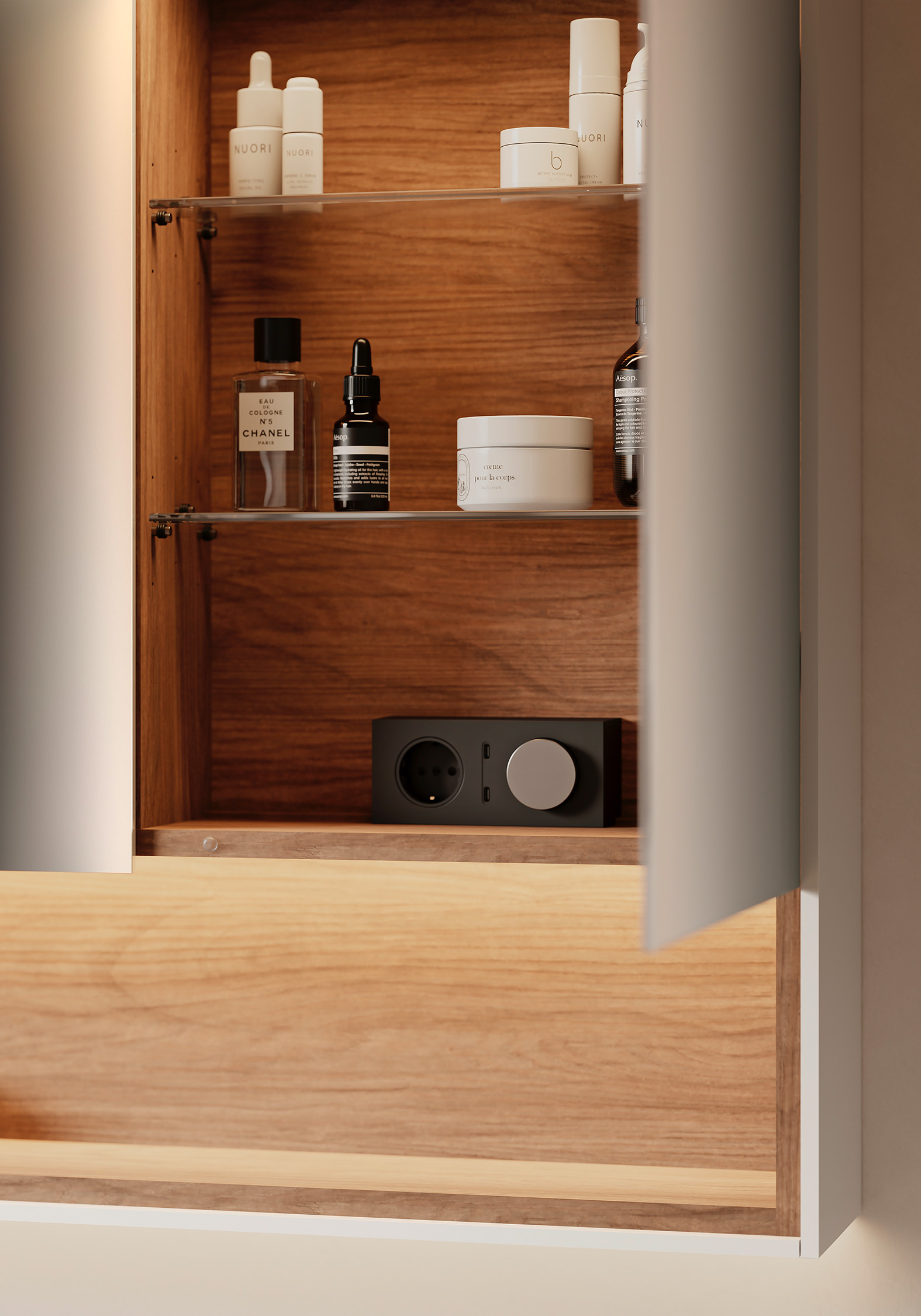 Alle Modelle verfügen über eine Waschtischbeleuchtung. Die über den Spiegeltüren eingesetzte horizontale LED-Beleuchtung kann als vorkragendes Lichtsegel oder als dezentes, bündig integriertes Lichtband gewählt werden. Zu der hochwertigen Innenausführung gehört unter anderem auch die neue E-Box mit Drehschalter zum Dimmen und zur Lichttemperatursteuerung, eine Steckdose und zwei USB-C-Ports.